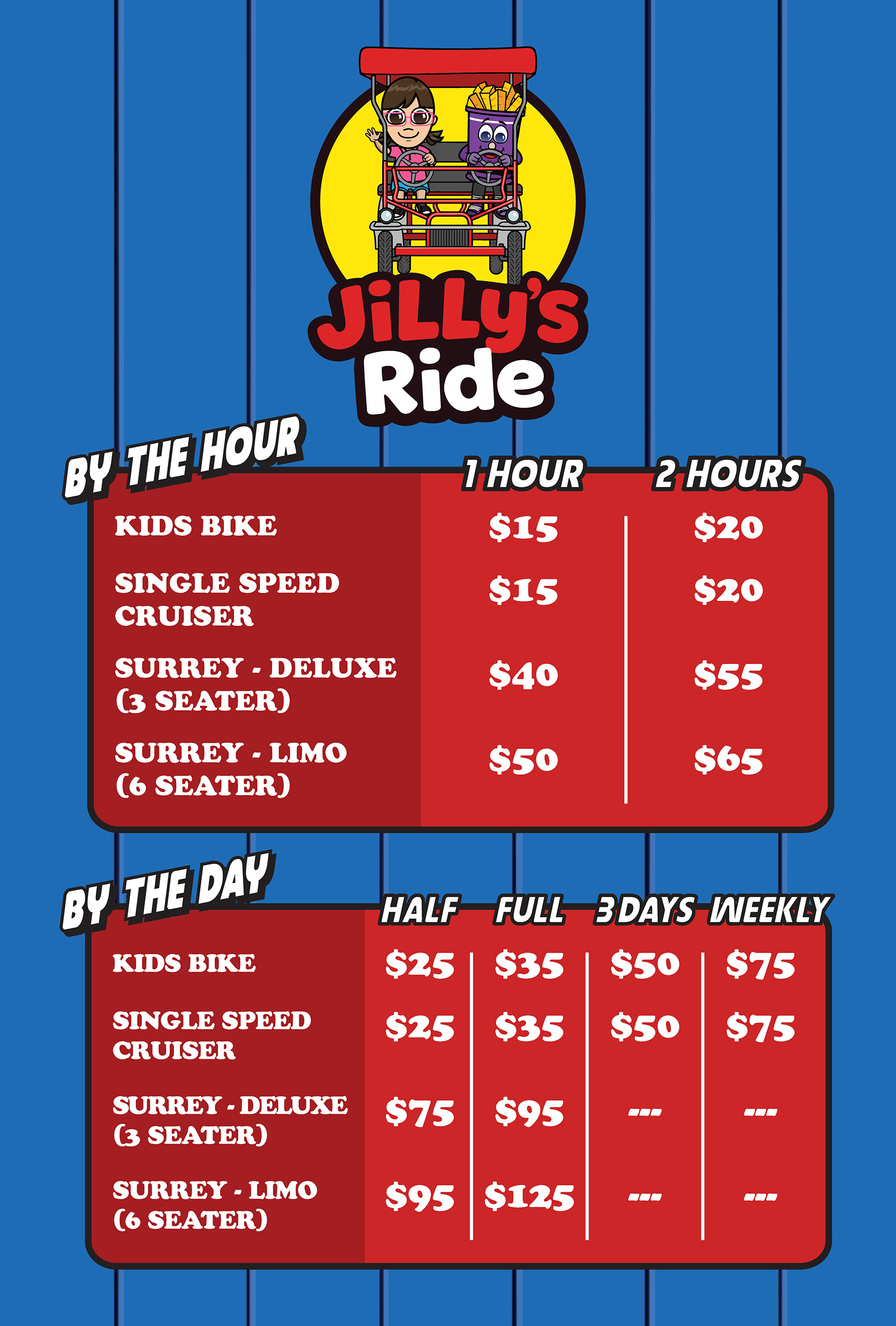 JiLLy’s Ride has teamed up with OC Bikes to bring bike rentals to 12th Street and the boardwalk. Cruise the Ocean City boardwalk your way, whether you’re rolling in a classic beach cruiser, gliding with the family in a surrey bike, or getting the kids rolling with a kids’ bike rental.
