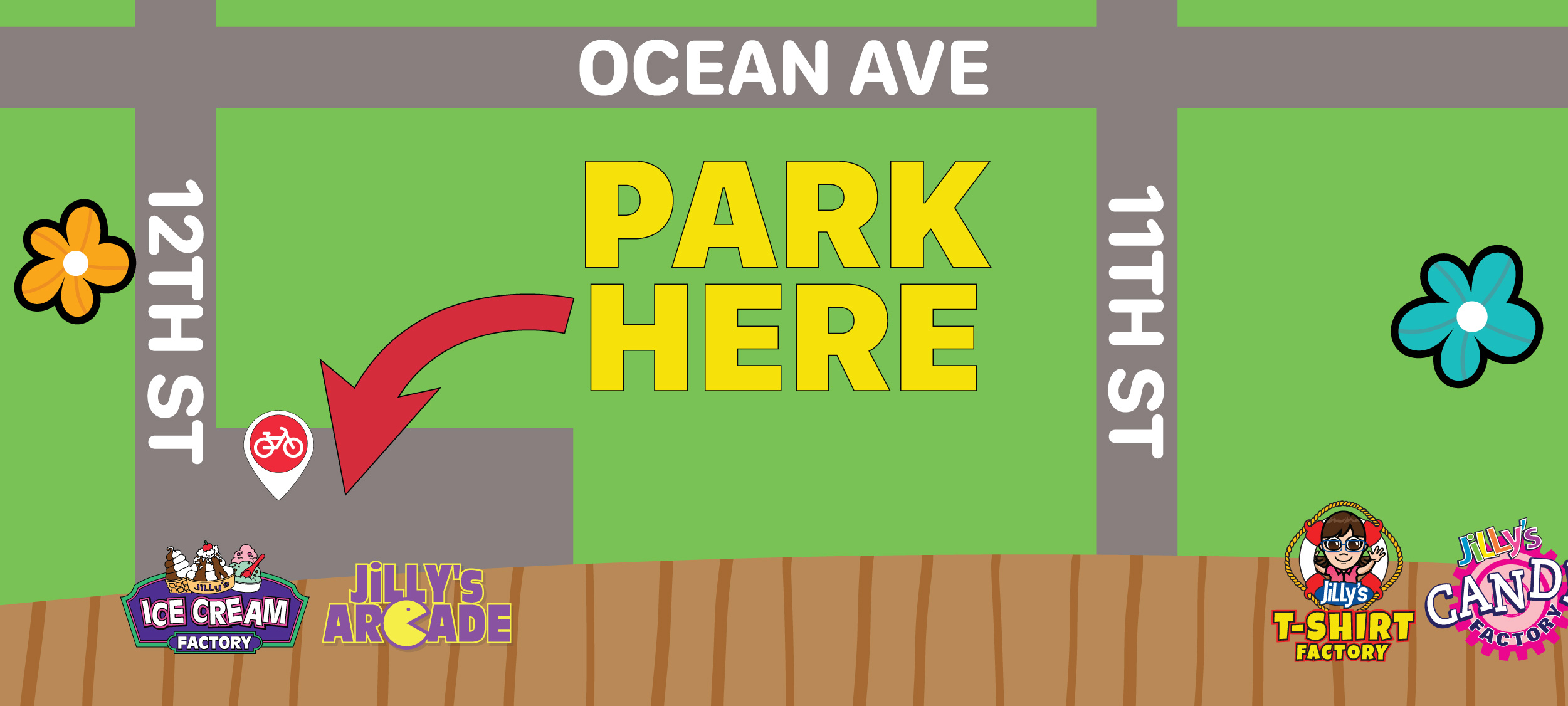 Parking at JiLLy’s is so easy. Simply pull up to 12th street and Boardwalk. You will see our lot on the left at the rear of JiLLy’s Arcade. Once you park, you are just a few steps to the beach and boardwalk. Our superb location also features handicapped access ramps that lead directly to the beach and boardwalk as well as public bathrooms, lifeguard / first aid station and Ocean City Police substation.